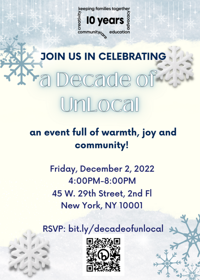 Join us in Celebrating a Decade of UnLocal with our community. It will be an evening full of delicious food, visual and performing arts, and remarks from the individuals who make UnLocal so special.