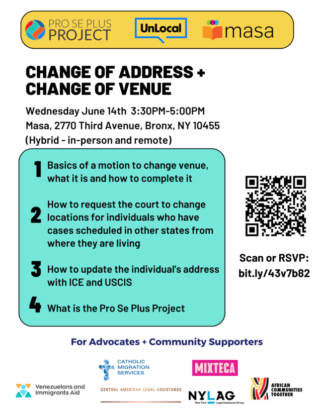 Our next Pro Se Plus Project training for community advocates and supporters will cover the basics of motions to change venue in immigration court as well as what to know about changes of address with the court, USCIS, and ICE.