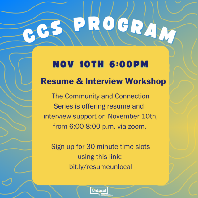 Never made a resume before? Looking to receive feedback on a resume you created? Nervous for an upcoming interview? The Community and Connection Series at UnLocal is hosting a Resume Review + Interview Tools Workshop.
