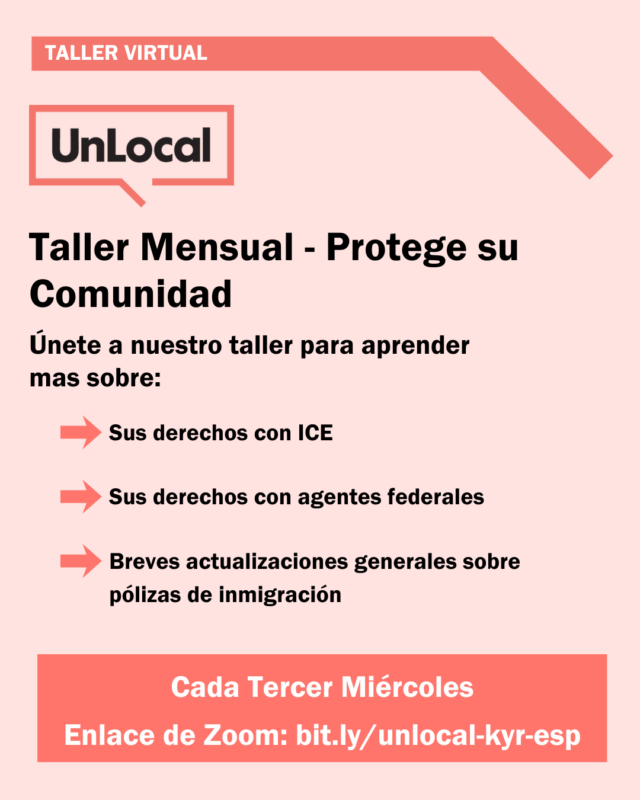 Únase a nuestros taller informativo mensuales sobre seguridad comunitaria, donde aprenderemos sobre nuestros derechos en lo que respecta a la interacción con las fuerzas del orden federales y los agentes de inmigración.