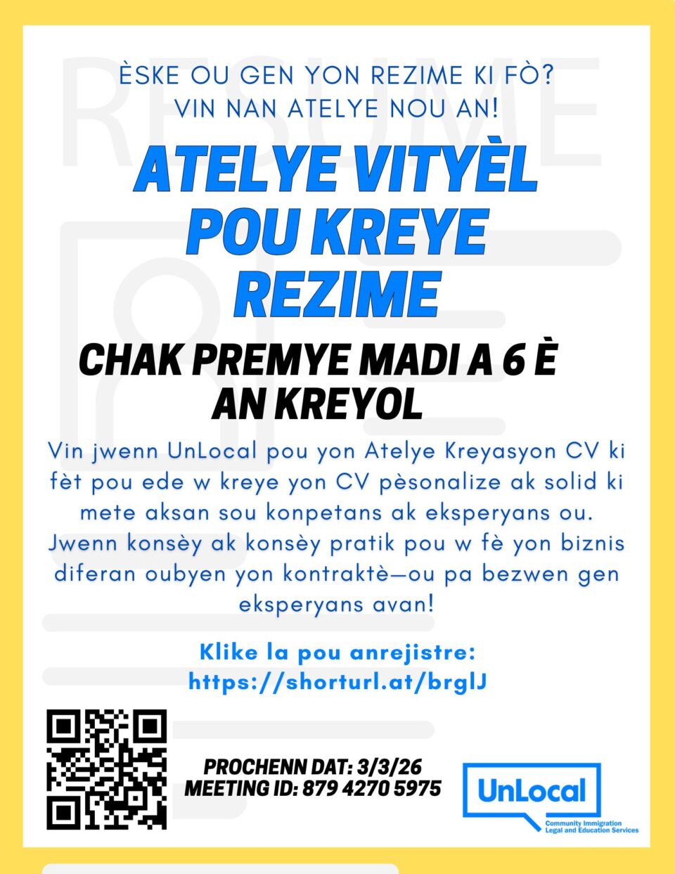 Join UnLocal for a Resume Building Workshop desgined to help you craft a strong, personalized resume that highlights your skills and experience. Gets hands-on guidance and tips to stand out as a business owner or contractor– no prior experience needed!